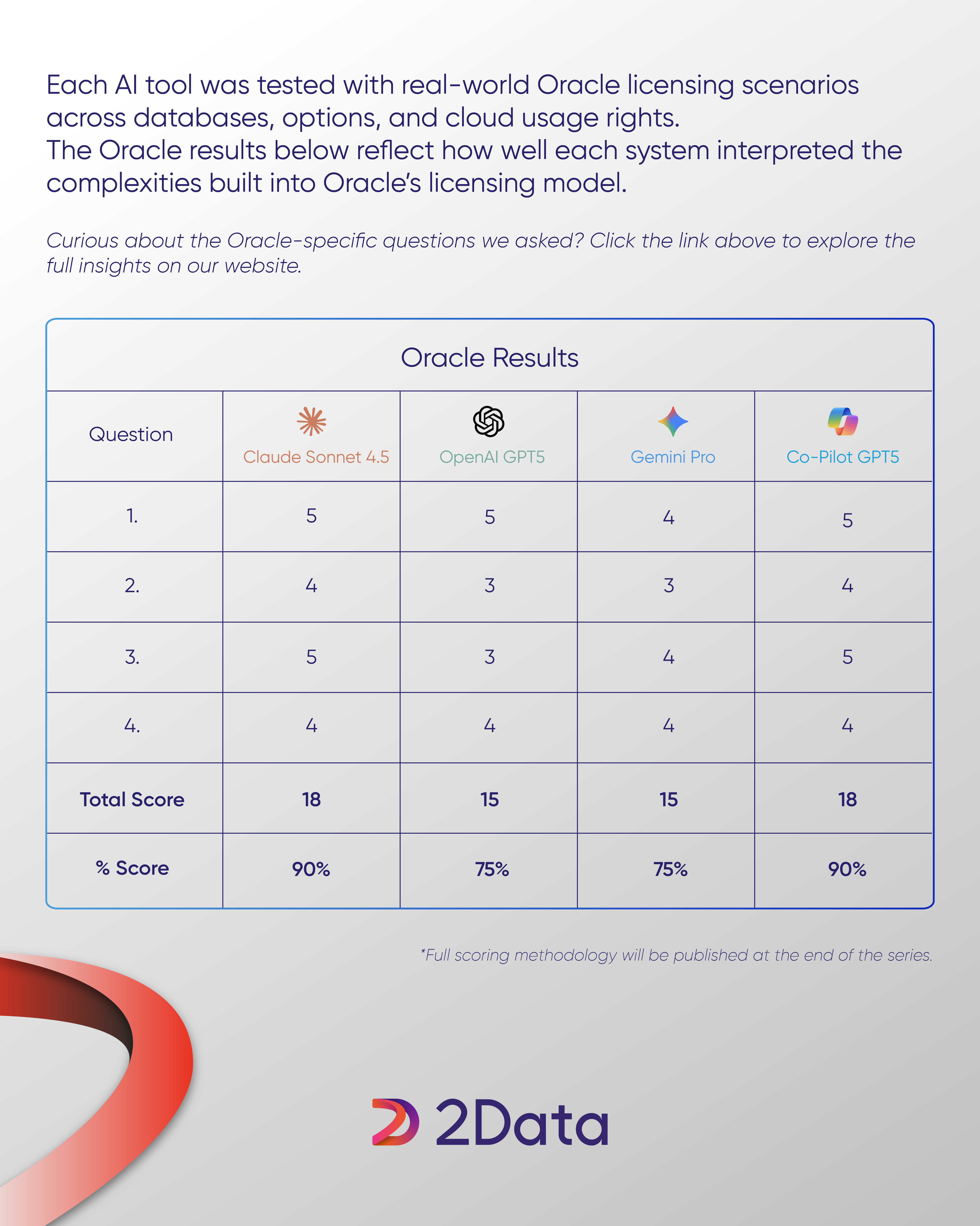 Each AI tool received the same Oracle licensing questions. Their responses were scored on accuracy, completeness, and practical usefulness, particularly in the context of Oracle audits, negotiations, and cloud migrations where incorrect interpretations can quickly escalate risk and cost.